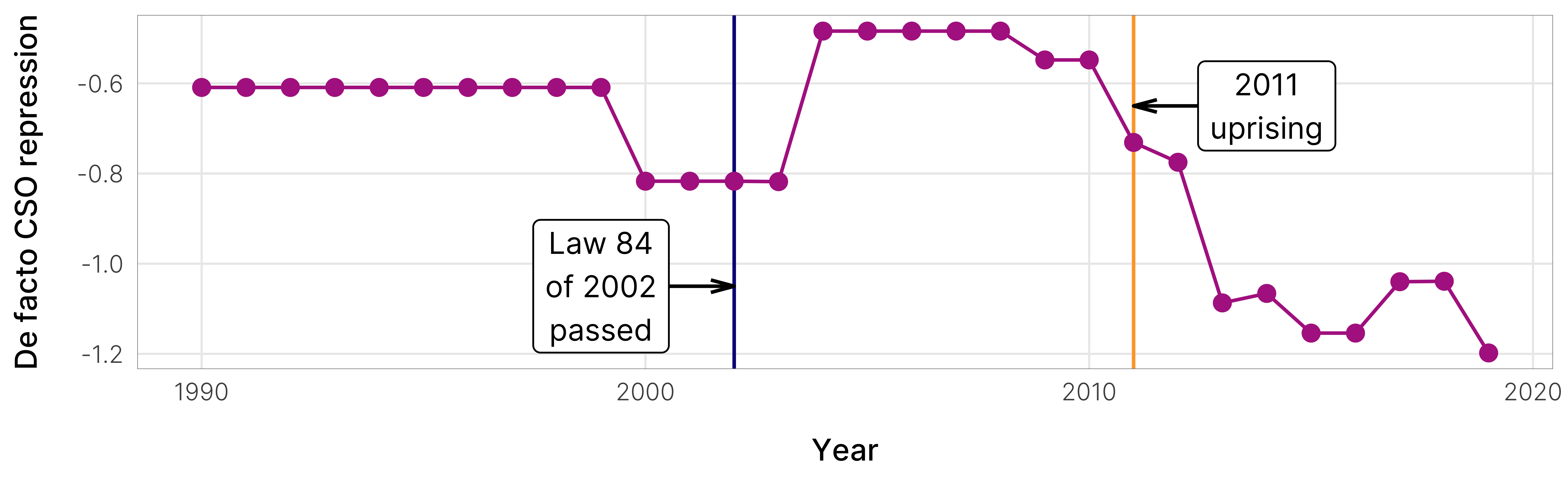 An increasing number of countries have recently cracked down on non-governmental organizations (NGOs). Much of this crackdown is sanctioned by law and represents a bureaucratic form of repression that could indicate more severe human rights abuses in the future. This is especially the case for democracies, which unlike autocracies, may not aggressively attack civic space. We explore if crackdowns on NGOs predict broader human rights repression. Anti-NGO laws are among the most subtle means of repression and attract lesser domestic and international condemnation compared to the use of violence. Using original data on NGO repression, we test whether NGO crackdown is a predictor of political terror, and violations of physical integrity rights and civil liberties. We find that while de jure anti-NGO laws provide little information in predicting future repression, their patterns of implementation—or de facto civil society repression—predicts worsening respect for physical integrity rights and civil liberties.